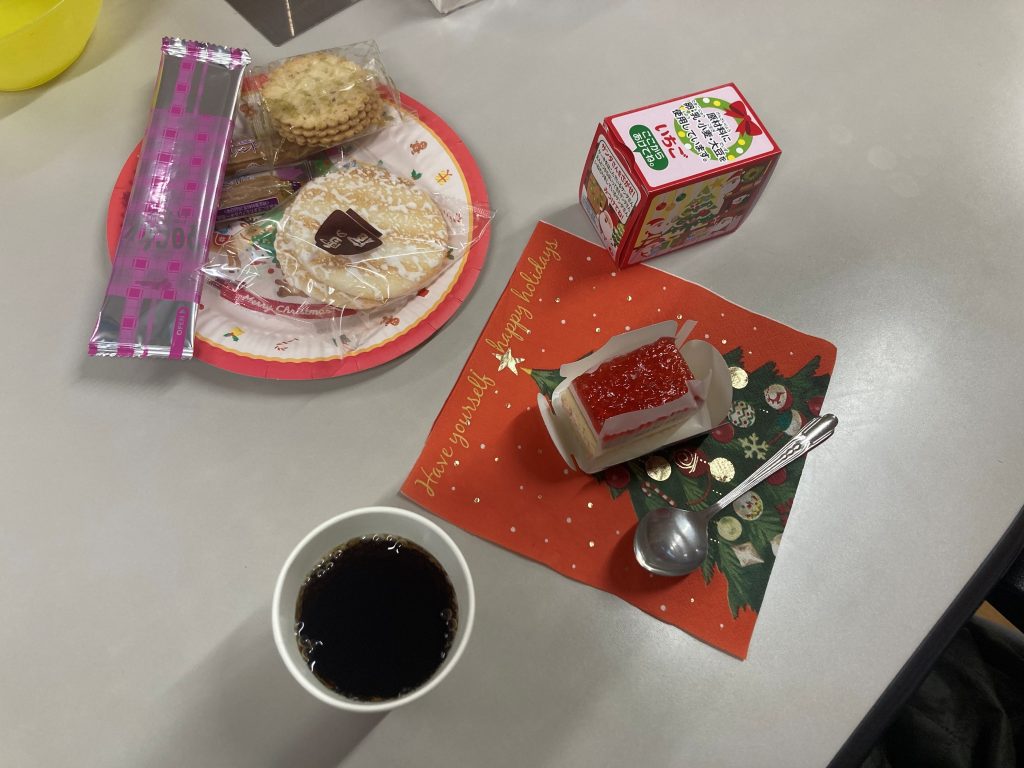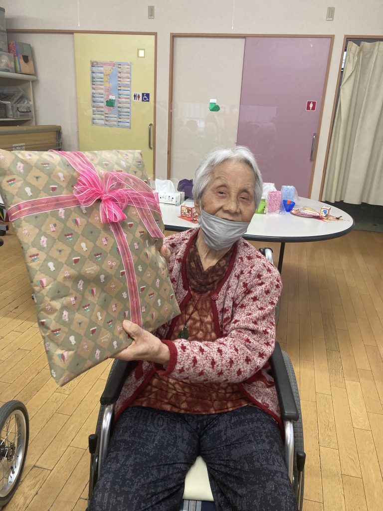 デイサービスのクリスマス会を開催しました。毎年恒例のビンゴ大会で大盛り上がりです。ビンゴで当たった利用者は大喜びです。サンタさんからのプレゼントにも笑顔でした。たくさんのお菓子とイチゴのケーキで楽しいクリスマス会となりました。