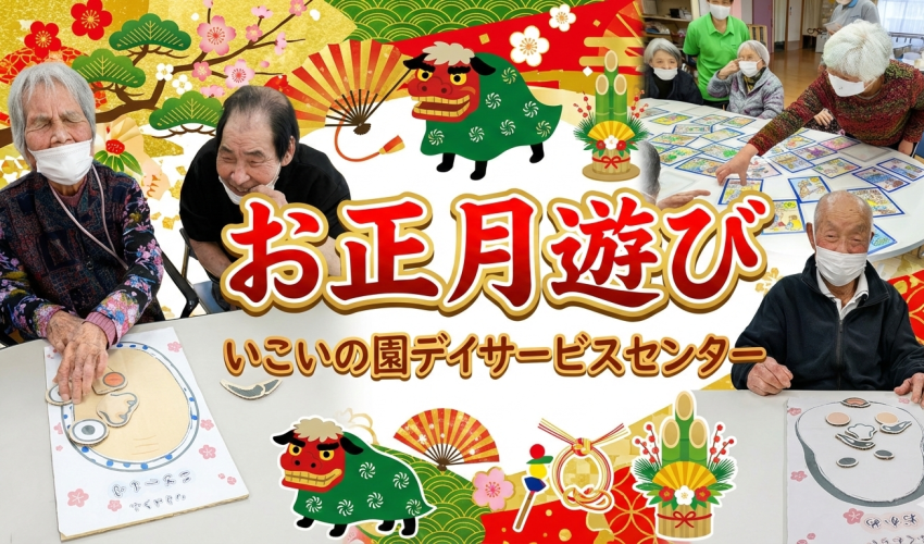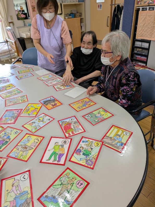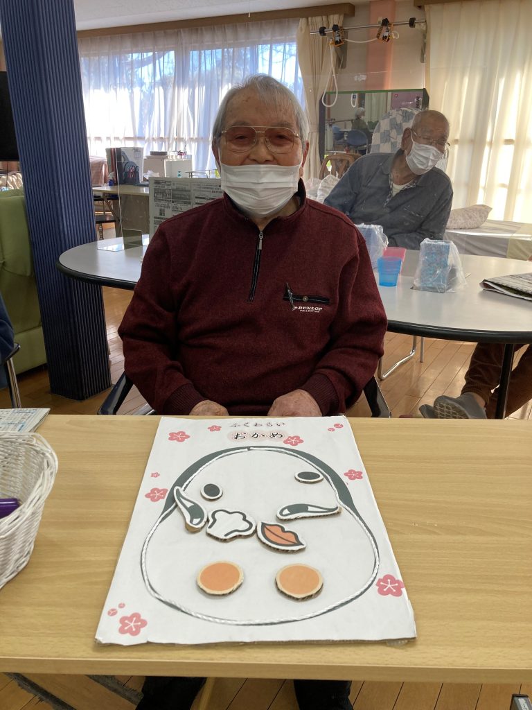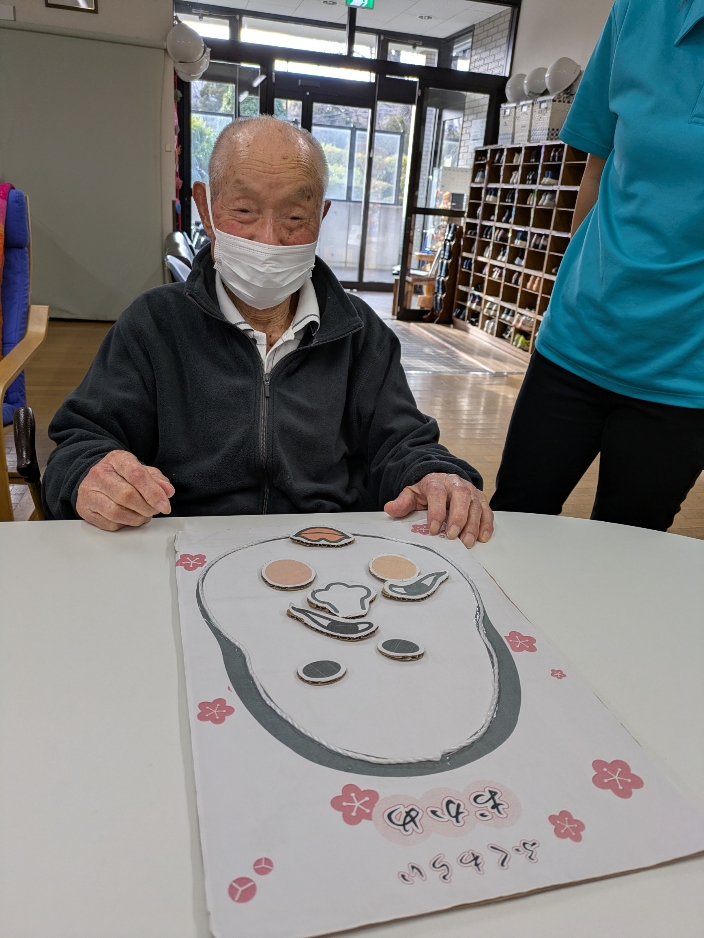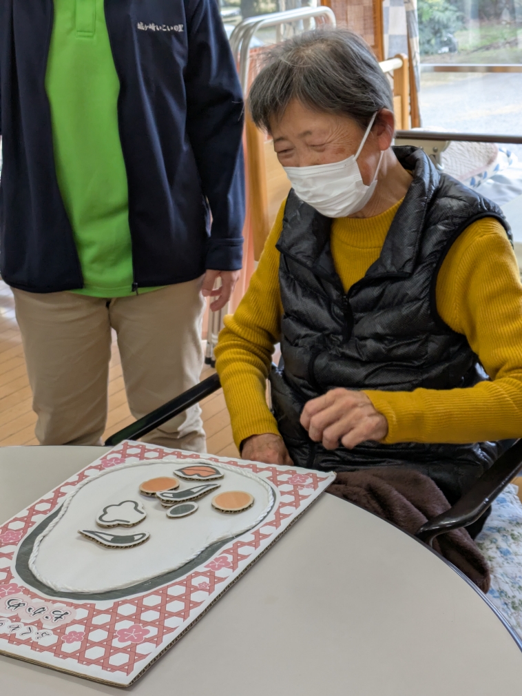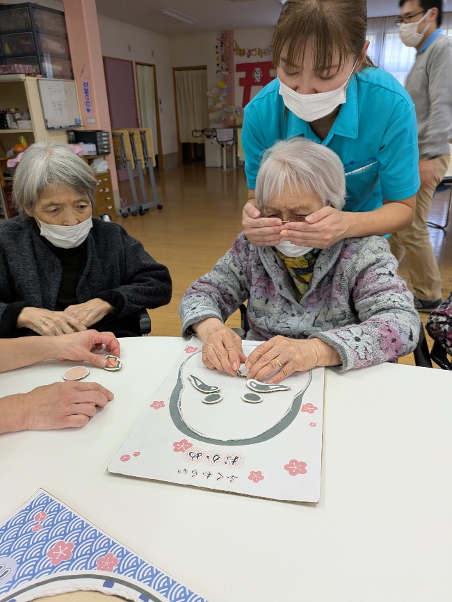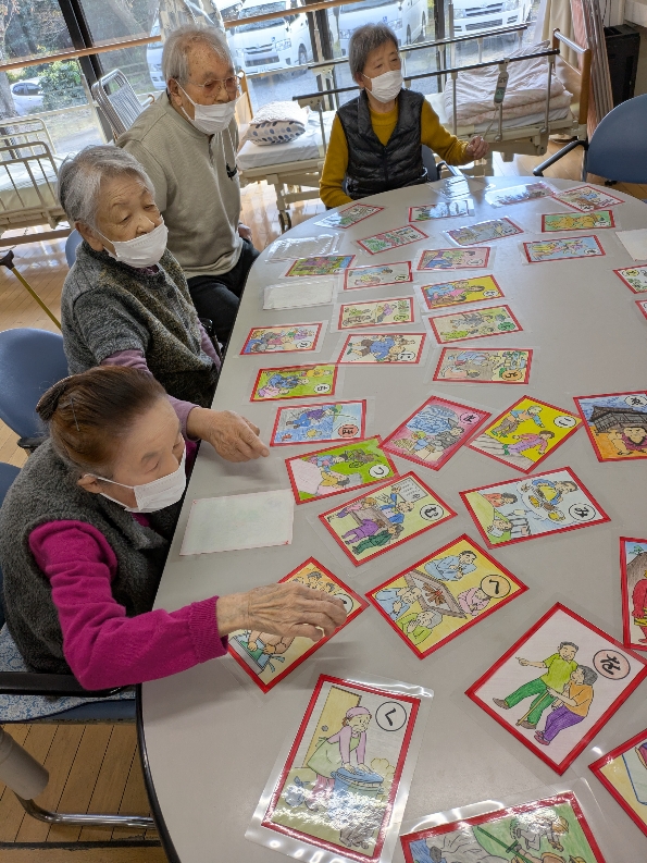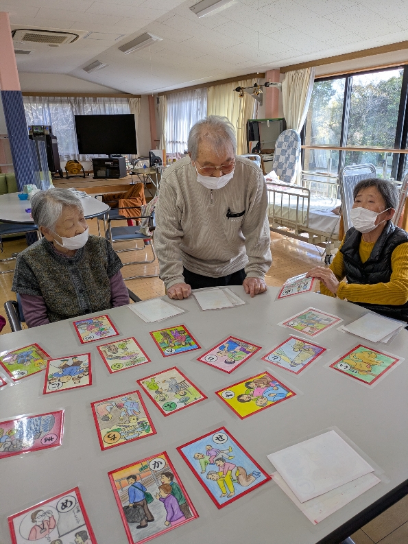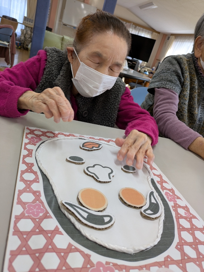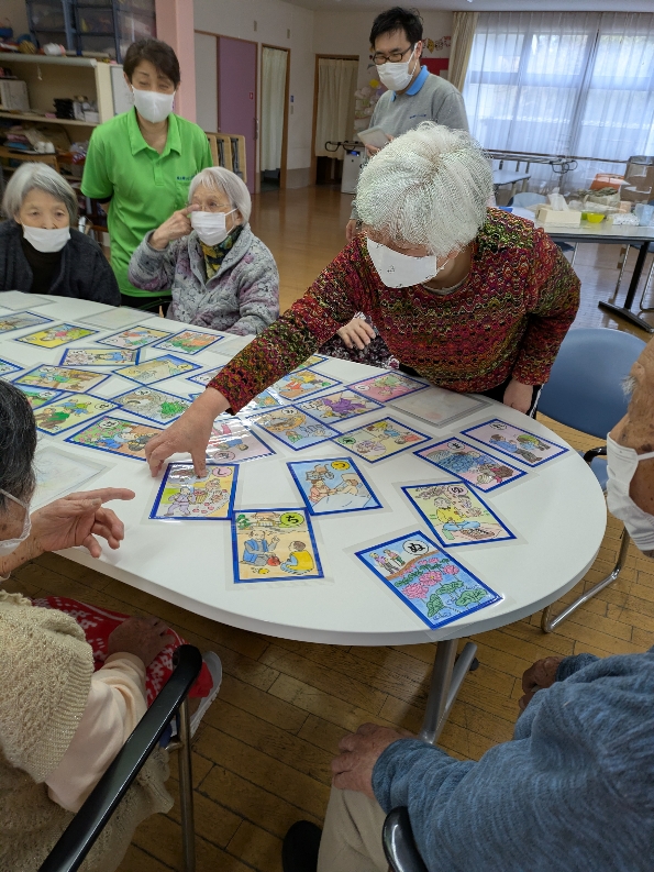 お正月明けのデイサービスでは、お正月遊びをしました。毎年恒例の福笑い、かるた大会で大盛り上がりでした。今年の、かるた大会ではみなさんがとても素早く、大決戦でした。福笑いでは、おかしな顔が完成して、みんなで大笑いでした。