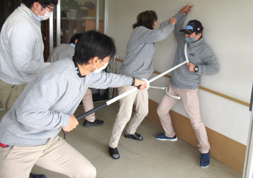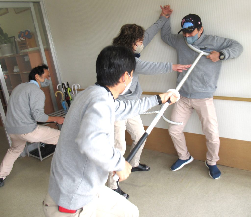 | 【写真解説】 さすまたを手に取り、複数名で不審者を壁際に追い込む訓練の様子です。 一対一で立ち向かうのではなく、チームで距離を保ち、相手の動きを封じる連携を確認しました。 |